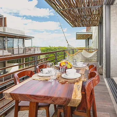 Luxury Loft - Jacuzzi, Gym, Sauna, Infinity-Pool, Jungle View - Nuju Rentals Tulum apartment offers convenient self-catering facilities, including a kitchen with a fridge, a toaster, and a cooktop. By participating in activities like cycling and billiards, guests can make their stay more exciting. The apartment features a terrace, ensuring optimum comfort.